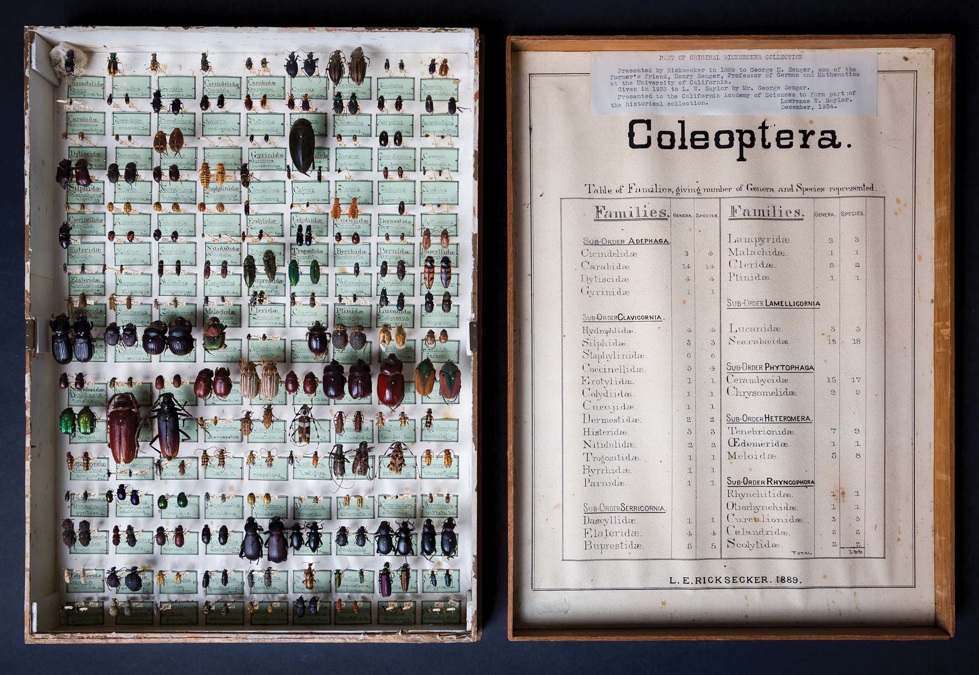 A particular specimen among the vast shelves full of every color in the rainbow caught my eye. I later learned that this piece I was so enamored of is known as a curiosity cabinet. The cabinet was beautiful, with two sides. One side was full of gorgeous insect specimens pinned over meticulous hand-lettered labels; the opposite side housed an extensive table explaining the insect order of beetles, or Coleoptera. The box was originally given as a gift from avid Coleoptera collector L. E. Ricksecker to the son of Ricksecker’s friend Henry Senger in 1880. In 1934, the California Academy of Sciences was granted possession of the cabinet via Lawrence Saylor as a contribution to the Academy’s historical collection. Each individual beetle specimen was beautiful, and the accompanying letters intrigued me. Three distinct styles of hand-drawn letters lived side by side in this single curiosity cabinet.