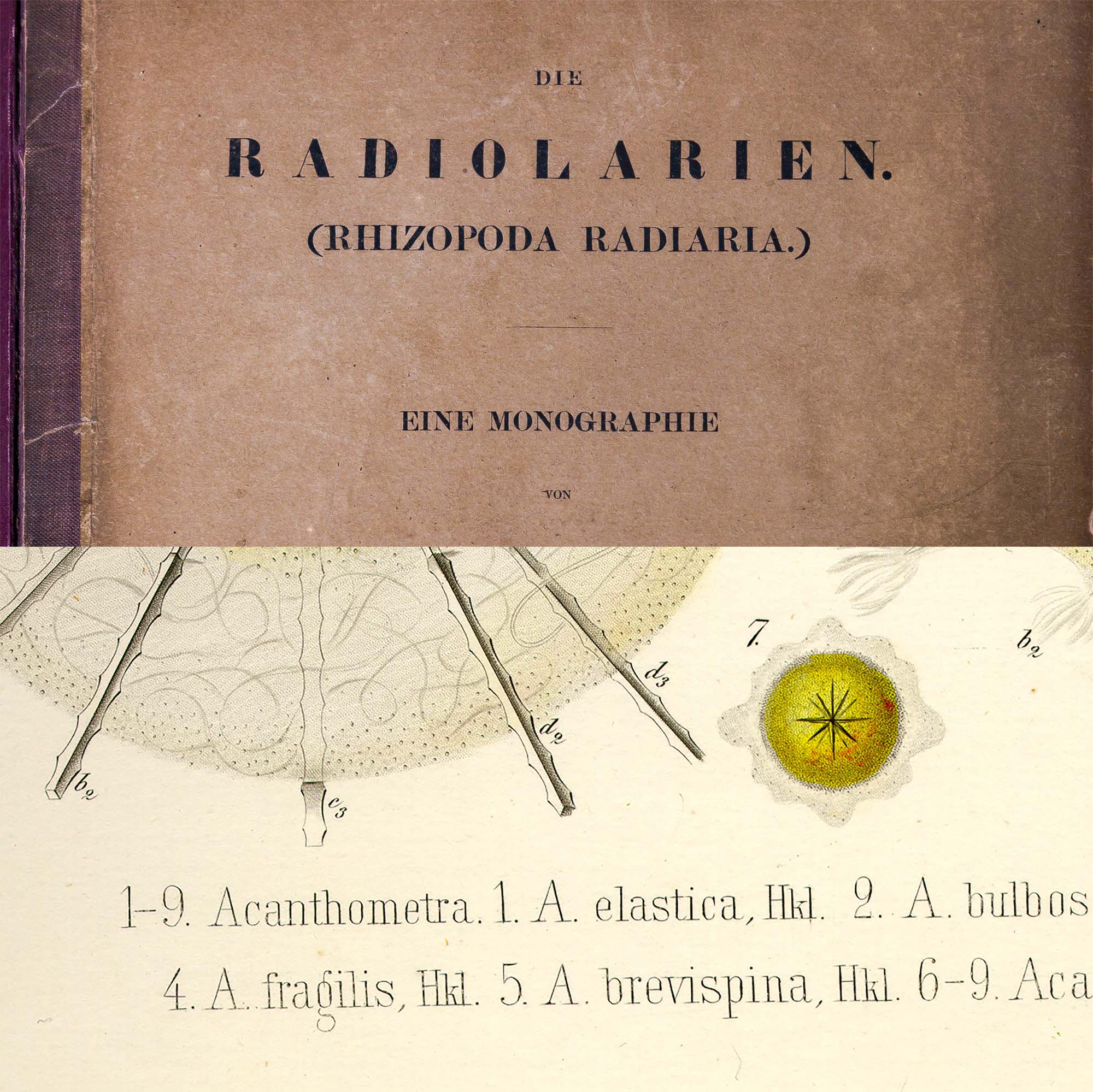Although the entomology specimen collection provided ample inspiration, my search did not stop there. I was hot on the trail of something fresh. Later in the week, a visit to a different department unexpectedly revealed a connection to the lettering styles found in Ricksecker’s curiosity cabinet. The geology collection had a small side room filled with books related to the study of the solid bits of our Earth. Shelves and stacks of field notes and giant tomes of research loomed everywhere. During my rummaging and reading, I stumbled on a book called RADIOLARIAN etc.* Radiolaria are ocean-dwelling protozoa (single-cell organisms) that produce intricate mineral skeletons. Marvels of evolutionary design, the skeletons come in fascinating shapes and configurations. I fell in love with the geometry of the skeletons in the book; then I noticed that the illustrated specimens were annotated with thin monoweight condensed slab serif lettering. RADIOLARIAN was published in 1862 by German scientists in Berlin, less than twenty years before Ricksecker’s cabinet construction—a similar time frame for a similar lettering style produced 5,600 miles away.