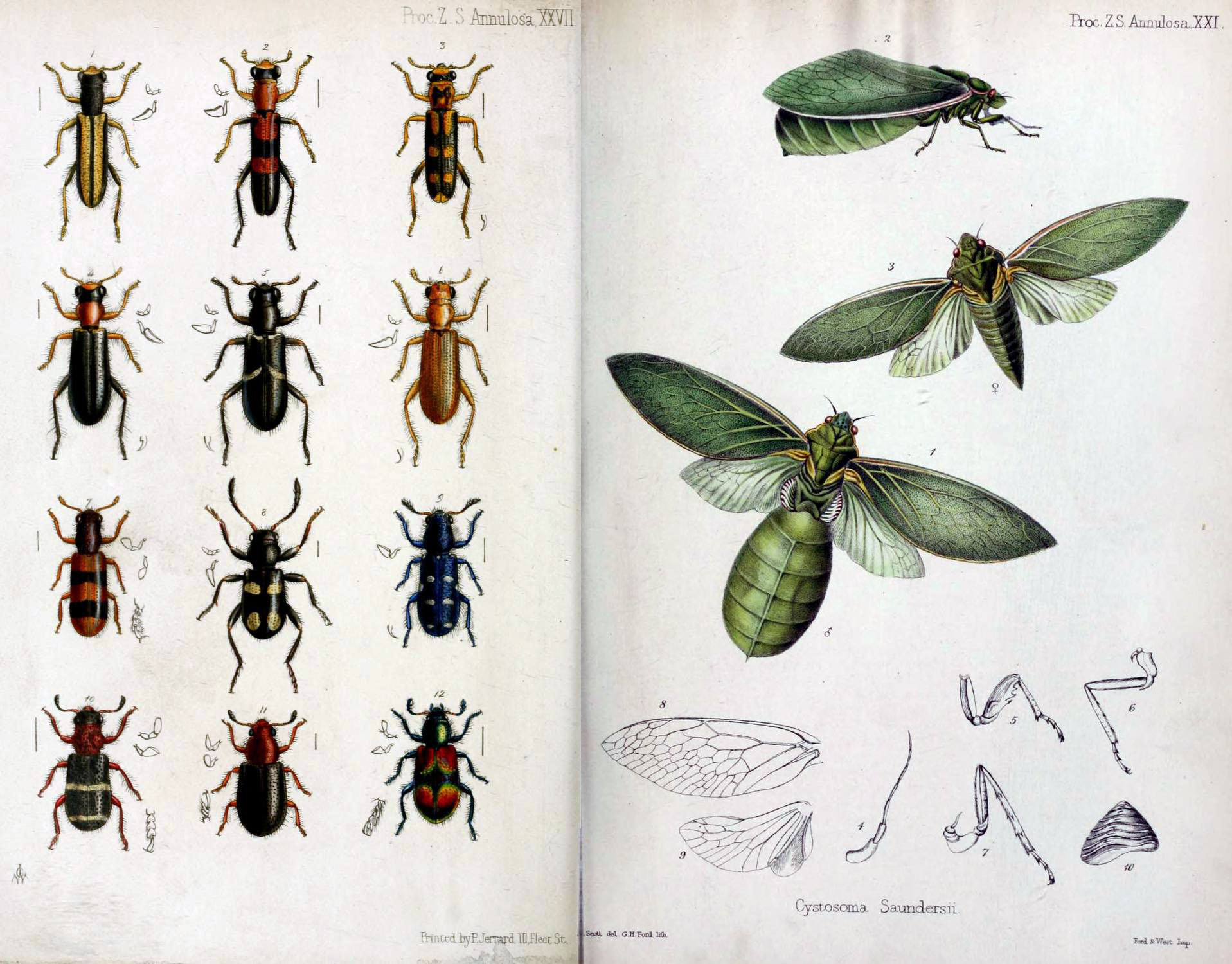 Following my visit, my research into late-nineteenth-century scientists’ usage of condensed slab styles of letters continued. I consulted online library resources in search of more documentation of specimens from the same general time frame as the Ricksecker and RADIOLARIAN examples. After perusing various websites, I ended up checking the reference section of the Wikipedia entry on Cleridae, where I found an image plate from the Proceedings of the Zoological Society of London. The plate consisted of twelve species of checkered beetles (Cleridae family) in striking vibrant colors and styles, but even more intriguing were the typographic notes in an efficient monoweight slab serif, neatly tucked away in the corners. Going back online, I was able to find a scanned copy of this annual from a library in the UK, which turned out to have a publishing date of 1851—not far off from Ricksecker’s lettering or the RADIOLARIAN image-plate notations.