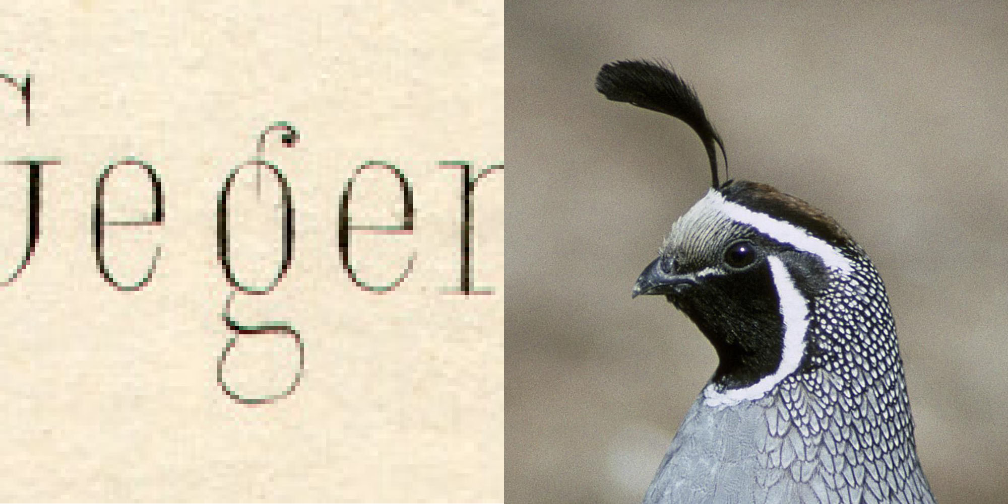 By transposing the quirks of the various samples into an amalgamated design, I gave Clariday’s styles a unique voice while keeping them connected via their shared skeleton. My goal was to evolve the essence of the found letters while incorporating sparkly idiosyncrasies from the different sources of inspiration. An example of this is the ear of g, present in the RADIOLARIAN book lettering, which aligns perfectly with the decorative tuft on a California quail’s head!