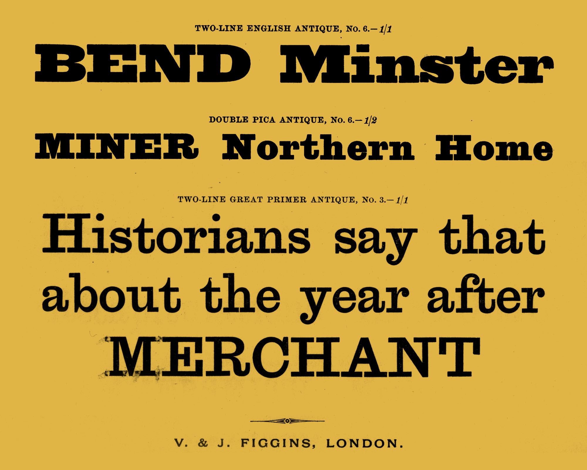 The Clarendon typeface, released in 1845 by Thorowgood and Besley of London, was not exactly pioneering but was popular enough to jump-start an entire genre of slab serifs with increased contrast between thicks and thins. It is suggested that the inspiration for the evolution of the slab serifs into the bracketed and contrasting Clarendons came from nineteenth-century capitals hand-lettered by copperplate engravers. A genre rooted in the earliest slab serif examples of Vincent Figgins’s foundry would evolve into a variety of Clarendons, from display-centric thin faces and fat faces to more sturdy regular and expanded styles.